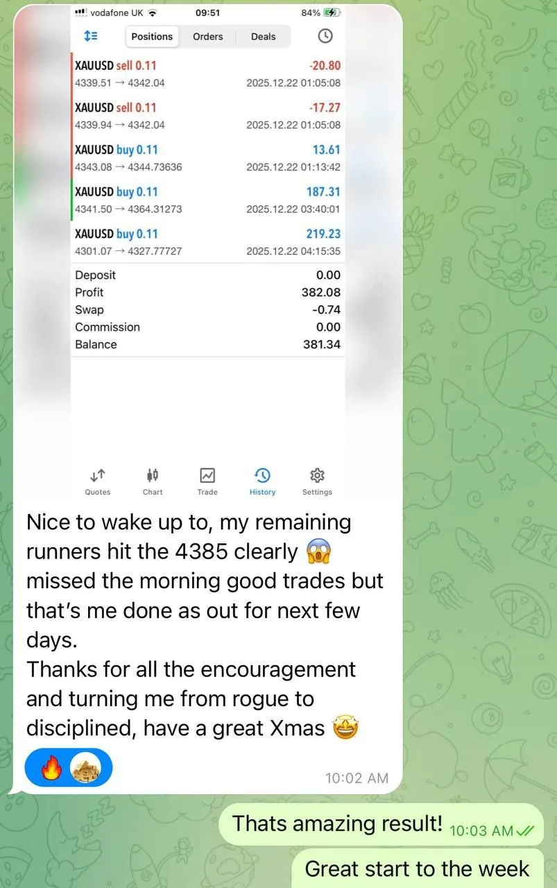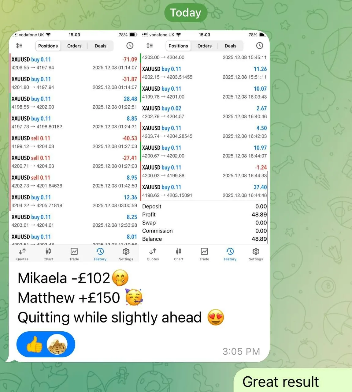 Free to join. The free community includes market analysis, live trading room, and select signals. Full VIP signals require a Vantage account (£300 minimum deposit). Past performance is not a reliable indicator of future results. Trading involves risk and losses may exceed deposits.